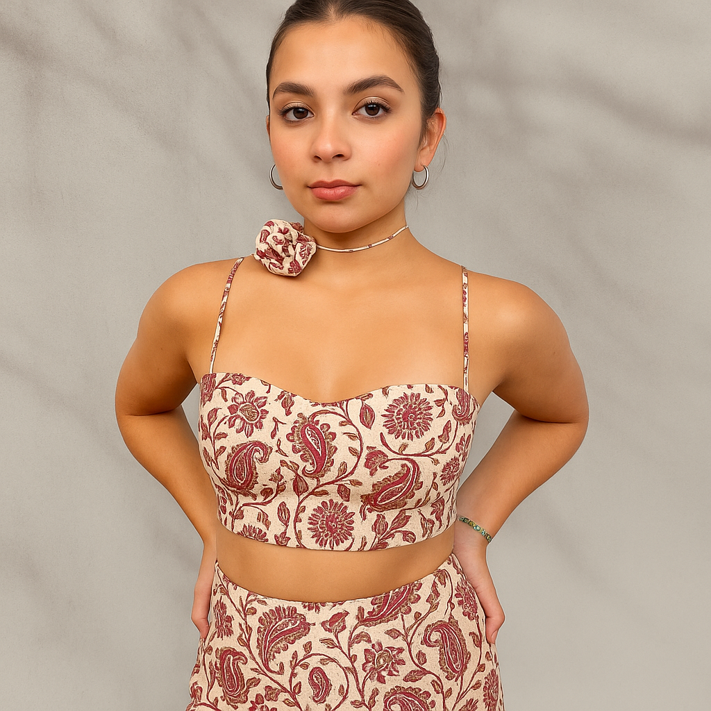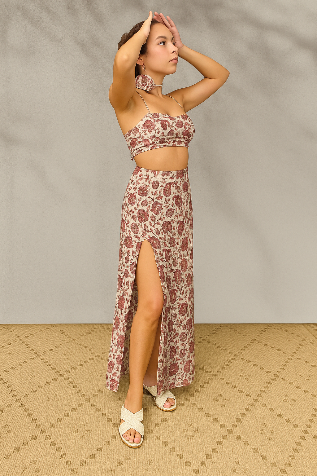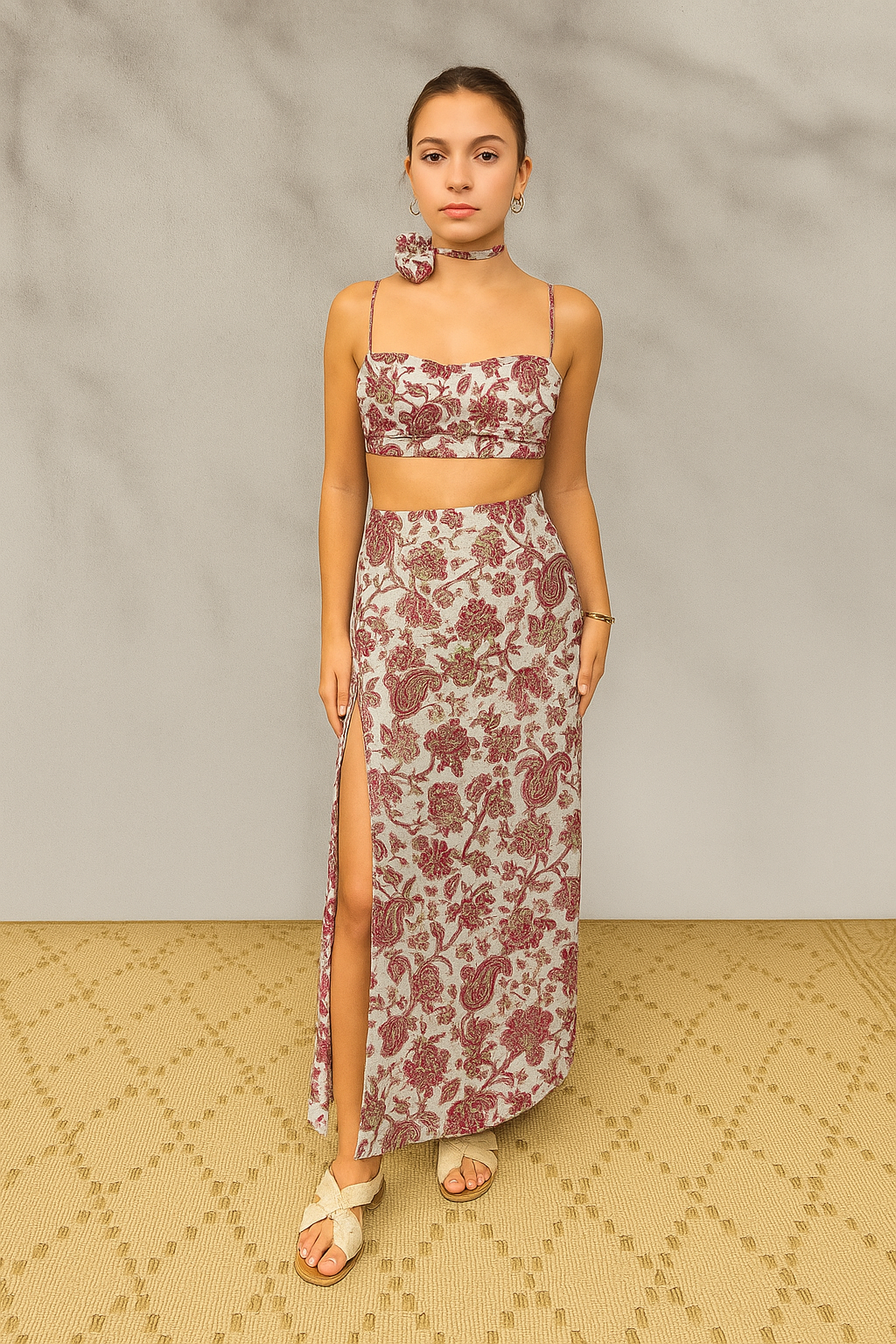 Elevate your wardrobe with the Rosé Reverie ensemble, featuring a delicate floral printed top paired perfectly with a stylish slit skirt. This combination balances feminine charm with a contemporary edge, ideal for both casual outings and refined occasions. The floral print adds a touch of natural elegance, while the slit skirt offers subtle movement and sophistication, enhancing your silhouette with every step. Crafted to provide comfort without compromising on style, Rosé Reverie is a versatile choice for the discerning fashion enthusiast.